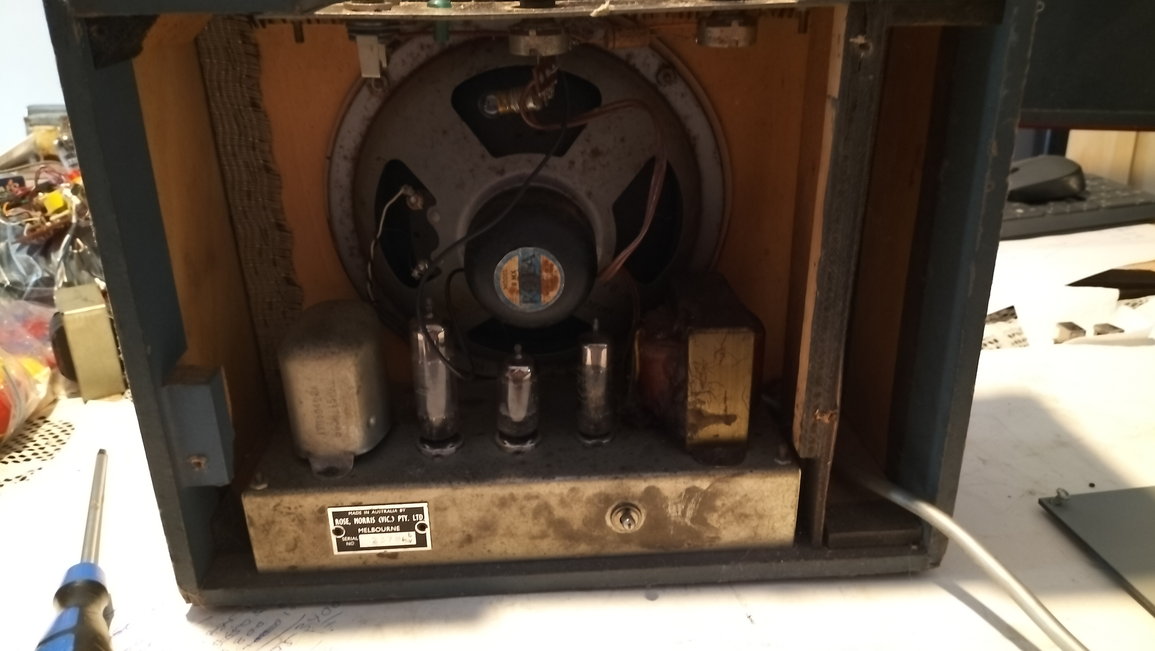 Note the Rola 8MX speaker, an 8-inch unit with a secondary co-axial whizzer cone denoted by the “X” for “extended” range.